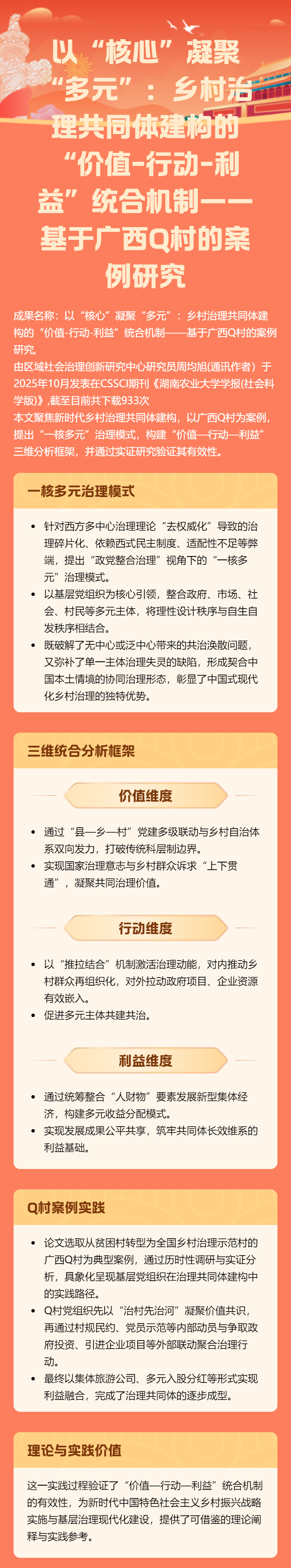 2025年度代表性成果之一:以“核心”凝聚“多元”:乡村治理共同体建构的“价值-行动-利益”统合机制——基于广西Q村的案例研究(周均旭)