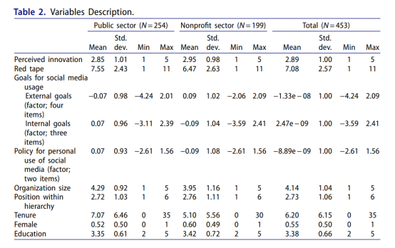 研究采用2015年国家行政研究项目-公民(NASP-C)调查数据,该调查由亚利桑那州立大学组织研究中心设计,通过亚马逊MTurk平台收集。研究样本限定于公共和非营利部门的全职员工,共453名受访者,其中公共部门254人,非营利部门199人。选择这两个部门的原因在于它们共享同一公共领域,都寻求实现公共价值,且可以从彼此的社会媒体应用经验中受益。