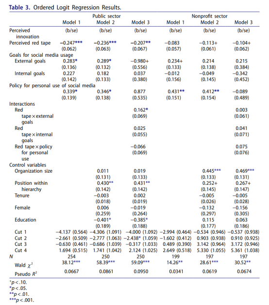 描述性统计显示,非营利组织(67.3%)比公共组织(61.4%)更倾向于采用社交媒体,这与其主动利用社交媒体筹集捐款、建立支持者关系的需求一致。非营利组织的感知组织创新平均值(2.95)略高于公共组织(2.85),而公共组织的感知繁文缛节平均值(7.55)高于非营利组织(6.47)。