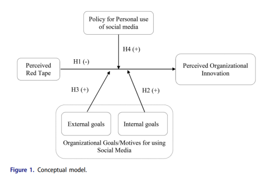 (此处为图1:概念模型,显示自变量“繁文缛节”、因变量“感知创新”,以及调节变量“社交媒体内部目标”、“社交媒体外部目标”和“社交媒体政策”之间的调节关系)